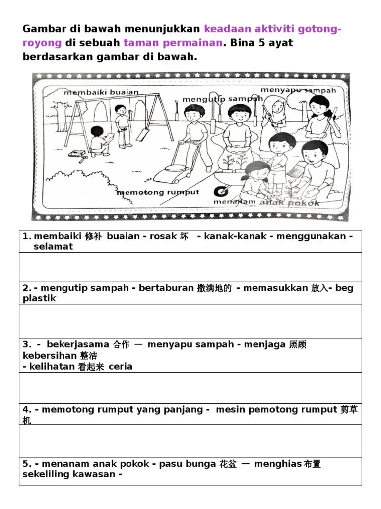 Lengkap berdasarkan gambar di bawah. Bina satu aktiviti sahaja dalam satu ayat. Bina lima ayat berdasarkan gambar di bawah.